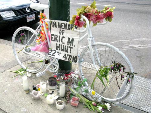A ghost bike placed near the site on Huntington Avenue where 22-year-old Eric Hunt was hit by an MBTA bus. The accident is under investigation by the Boston Police Department and the MBTA.