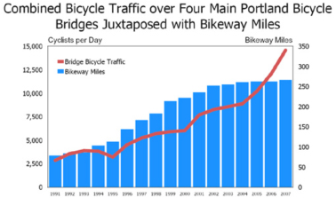 So instead of “build it and they will come” perhaps the appropriate analogy is a garden. Build it, plant the seeds, water them, keep the weeds out and they will come. In any case, several cities that have built bike lane networks have seen major increases in the cycling rate. Portland, Oregon is a prime example, as the chart at right shows.