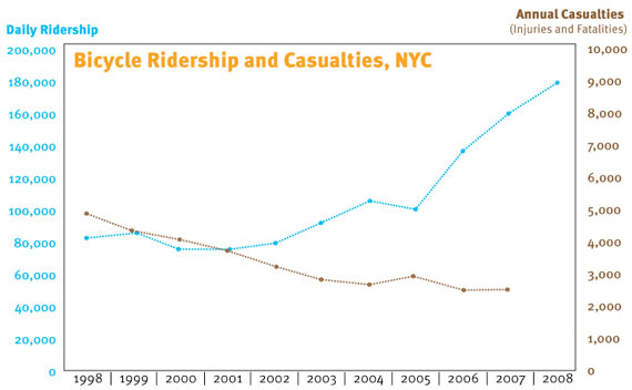 On the grand scale, the health benefits of cycling outweigh the risks of injury or death from car accidents. Perhaps the most convincing of the studies that show this is a large and long-term population study from Copenhagen. Nearly 7,000 people were asked a wide variety of questions, including whether or not they biked to work or not. The study then checked medical records on these individuals 15 years later. Even after adjusting for other risk factors, those who didn’t cycle to work experienced a 39% higher mortality rate from any cause than those who did cycle to work. Of “any cause” includes, of course, traffic accidents.
