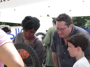 Aisha Shillingford, a graduate of Bikes Not Bombs' vocational ed class, shows a biking family her work.