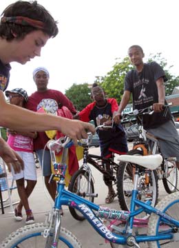 On a recent Saturday a 9-year-old boy rode up on an older mountain bike and asked us if we had helmets. Most youth I’ve met wouldn’t take a helmet if you paid them, so I was visibly shocked. “What?” I had to explain that we’d requested them from the Boston Public Health Commission, but they hadn’t arrived yet. (Thanks to Boston Bikes, the first order of helmets that we will offer for $7.50 is being made today.)